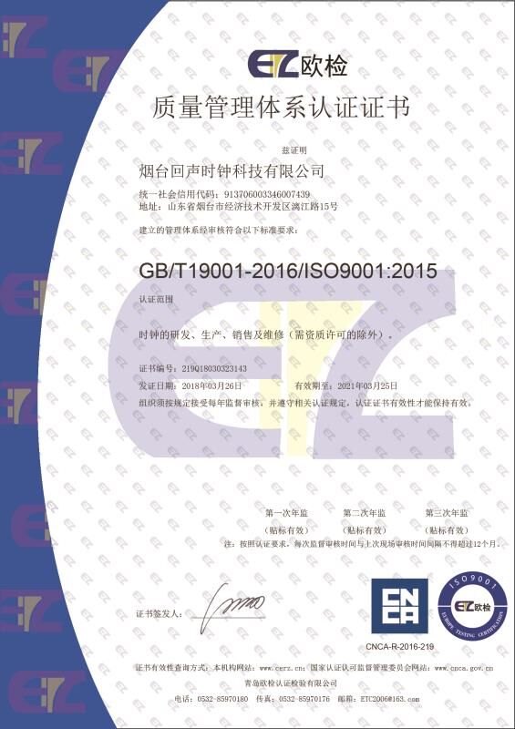 熱烈祝賀我公司順利通過(guò)ISO9000質(zhì)量管理體系認(rèn)證,通過(guò)一年的緊張努力的整理、整頓、改進(jìn)各項(xiàng)生產(chǎn)工序、生產(chǎn)工藝,今日順利通過(guò)9000質(zhì)量認(rèn)證專家組的評(píng)審,這是我們公司在產(chǎn)品質(zhì)量方面更上一個(gè)臺(tái)階,我們嚴(yán)把產(chǎn)品質(zhì)量關(guān),把這個(gè)作為企業(yè)的生命線,認(rèn)真做好每一道工序,每一個(gè)產(chǎn)品零件,這樣才能保證產(chǎn)品整體質(zhì)量過(guò)過(guò)硬,讓客戶更放心,使用更安心,這也是回聲時(shí)鐘科技每一位員工共同目標(biāo),創(chuàng)造更好的產(chǎn)品服務(wù)于社會(huì)。